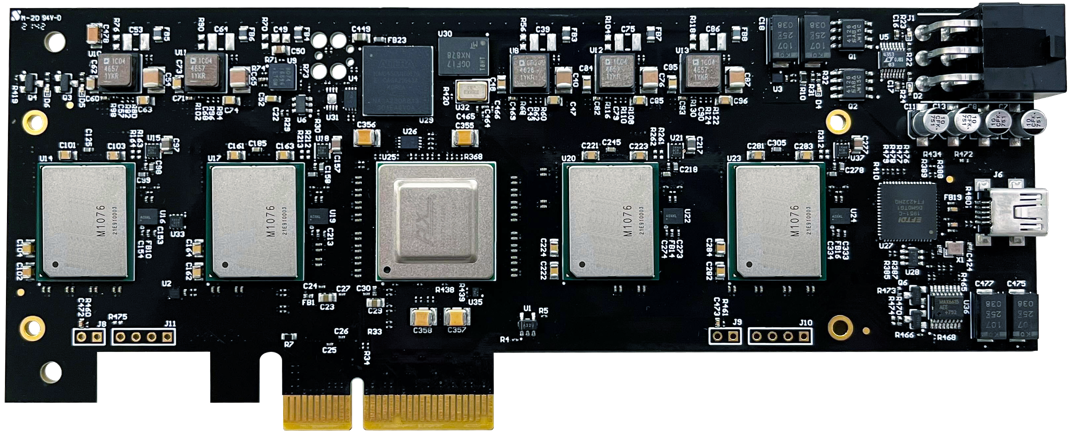 The Volga VP10304 Quad-AMP PCIe card enables high performance, power efficient AI inference for edge devices and servers. The half-height, half-length (HHHL) PCIe card simplifies the integration effort into platforms where space is a constraint. The VP10304 features four M1076 Volga Analog Matrix Processors (Volga AMP™), delivering up to 100 TOPs of AI performance and supporting up to 320 million weights for complex AI workloads at less than 25W of power. Large DNN models can be deployed on the VP10304 PCIe card using the combined AI compute of the four M1076 AMPs. The VP10304 can also run a variety of smaller DNN models for video analytics applications processing images from multiple cameras.