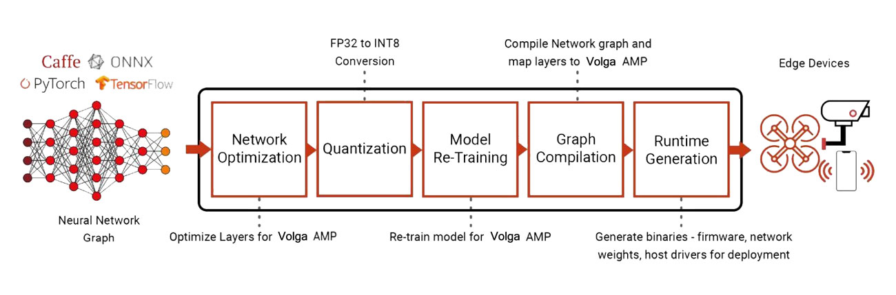 DNN models developed in standard frameworks such as Pytorch, Caffe, and TensorFlow are implemented and deployed on the Volga Analog Matrix Processor (Volga AMPTM) using Volga’s AI software workflow. Models are optimized, quantized from FP32 to INT8, and then retrained for the Volga Analog Compute Engine (Volga ACETM) prior to being processed through Volga’s powerful graph compiler. Resultant binaries and model weights are then programmed into the Volga AMP for inference. Pre-qualified models are also available for developers to quickly evaluate the Volga AMP solution.